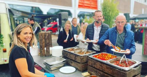 Gerechten worden bij onze catering op mooi aangeklede buffetten gepresenteerd waarbij wij uw gasten assisteren met het opscheppen. Intussen serveren wij lekkere hamburgers als hand-outs, snijden het vlees, de spare- ribs, en benen wij de kippetjes voor u uit. Allemaal in het zicht van uw gasten. Onze grote vuurgestookte instalaties staan erbij en hier wordt intussen al het lekkers op bereid.
